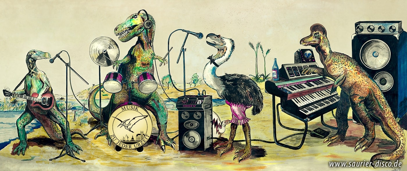Von der ersten Disco mit DJ MWJ hörten wir am 31.12.1969. Das war im Gutshaus in Schönhof. Wir sind glückliche Saurikaner und wurden live portraitiert, als der unruhige, einst junge DJ dringend eine Kullisse für seine schrottige Disco benötigte. Mit dieser trat er bereits seit 13 Jahren in Endmoränen-Landschaften auf. Seltsam, aber wahr. 1983 wurden wir, zehn Jahre vor Jurassic Park, dem Science-Fiction-Horror- und Abenteuerfilm von Steven Spielberg aus dem Jahr 1993, vom DJ als Mini-Aquarell der Maße 4,36 x 1,83 m gemalt.